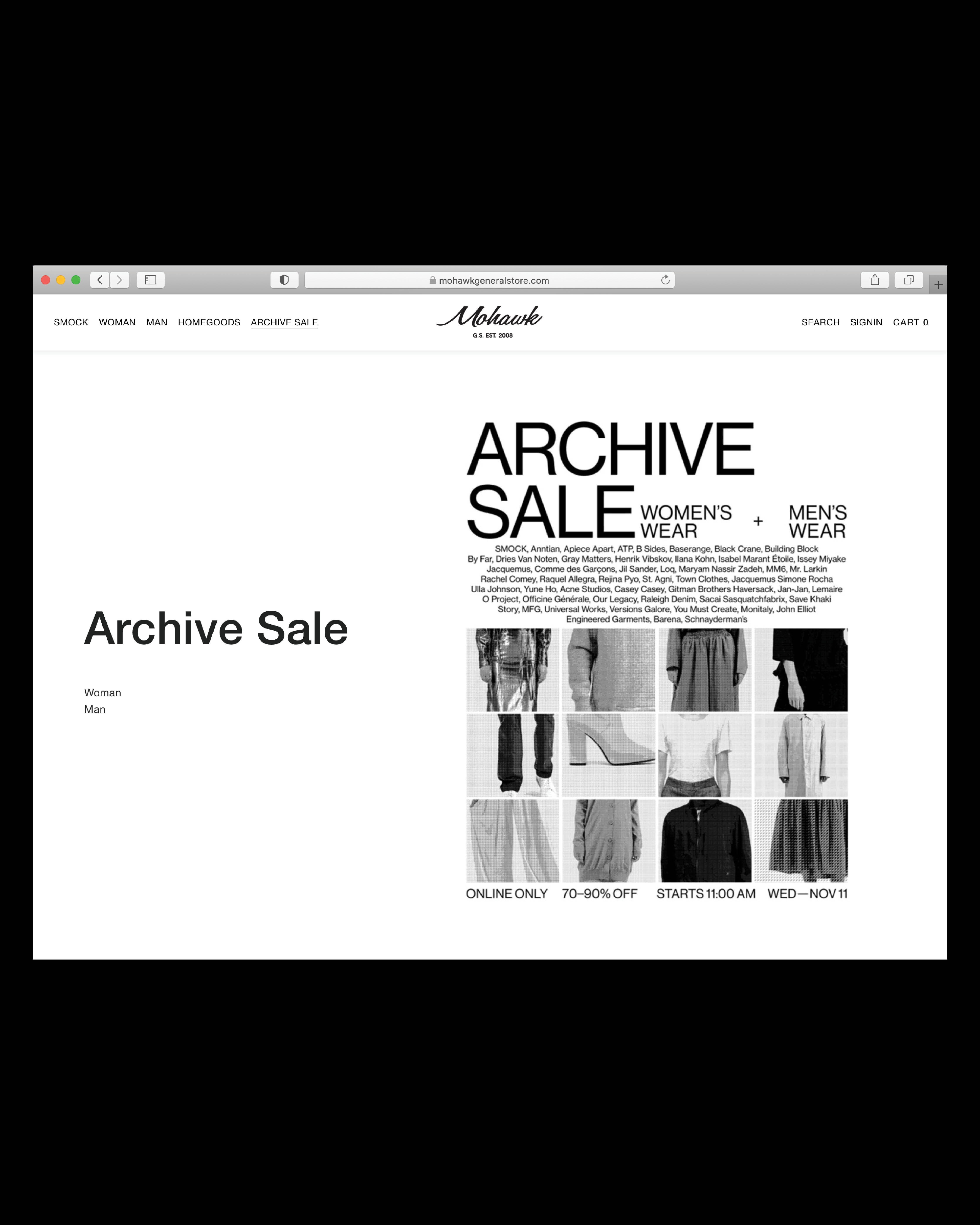 Flyers, motion, and other promotional assets to promote Mohawk General Store’s Archive Sale. The project was completed in one weekend, and the goal was to create something minimal that would be a quiet backdrop to all the brands featured in the sale. All imagery was bitmapped to obscure the specific clothing items, to pique interest in the sale without giving items away.