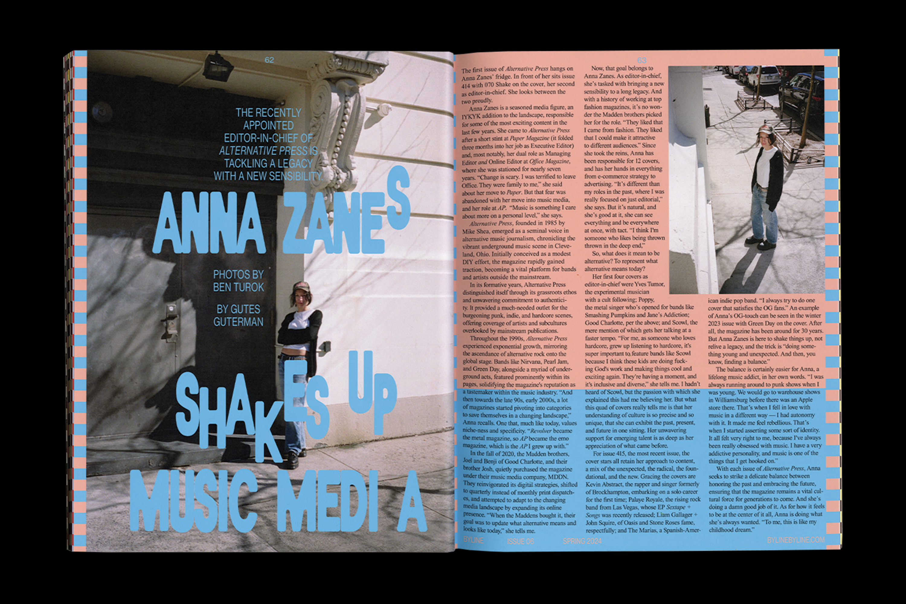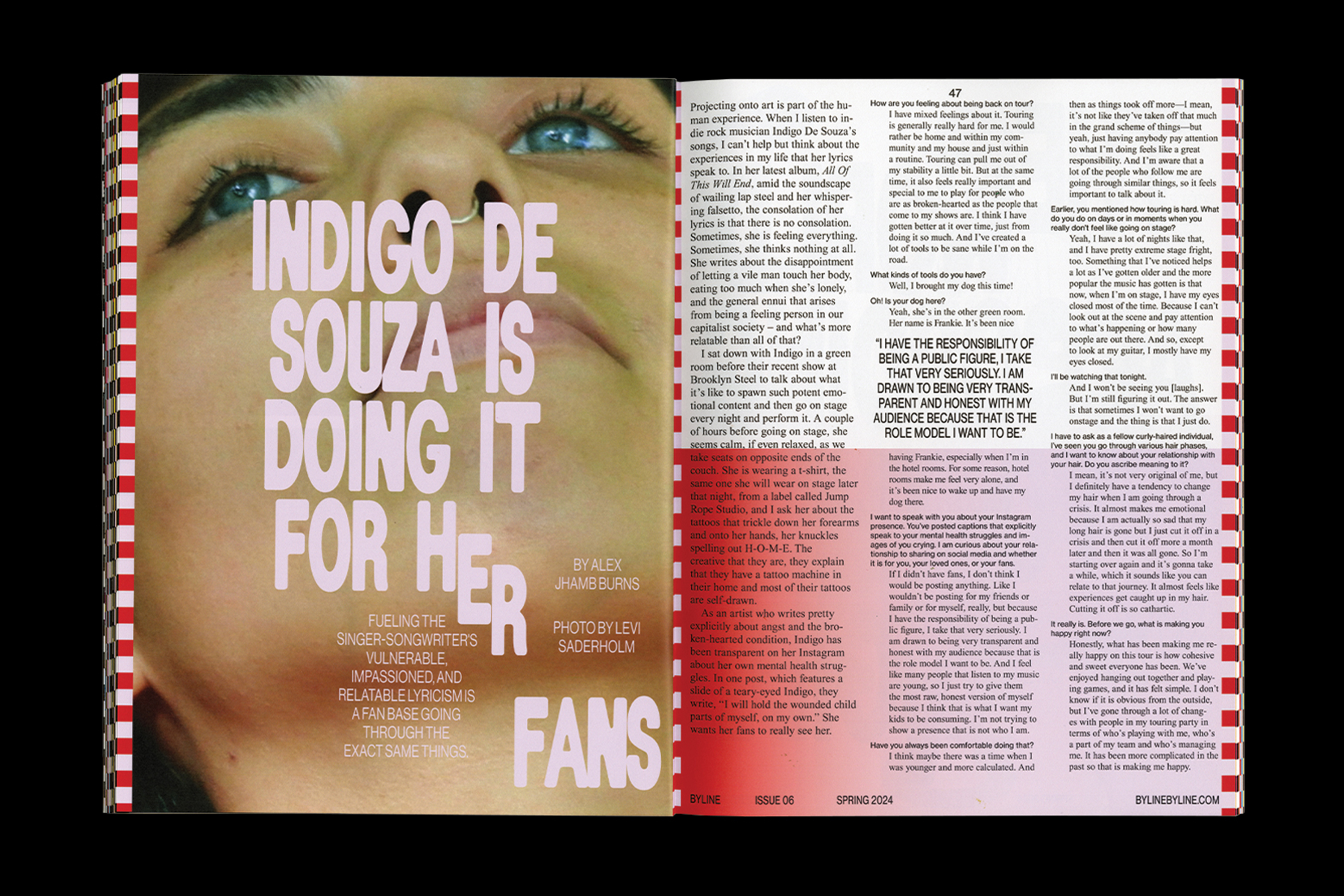 Byline Issue 06: Music to our EarsIssue 06 of Byline was themed Music to My Ears and centered around music and sound. Content ranged from a long conversation with cover star Julian Casablancas about his band The Voidz, to an essay on why noise-cancelling headphones shouldn’t exist. For this issue, I thought about what I love about music, and how I could translate those things to visual motifs. I clung to the idea of gradients and cascading type to capture melodies, and bold color combinations to capture the feeling of all the layers of sound that go into music. One of my favorite sensations of listening to an album all the way through is how you begin to memorize the order, and that expectation of a certain song starting after the previous becomes a sort of new song in itself. To emulate this feeling I lined each page with different checkered patterns, so you can begin to memorize where you are in the book, and can see what's ahead. Maybe you’ll begin to anticipate what checker pattern is coming next.